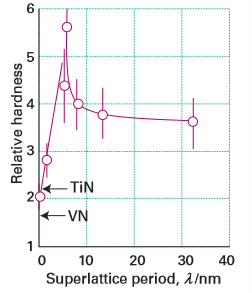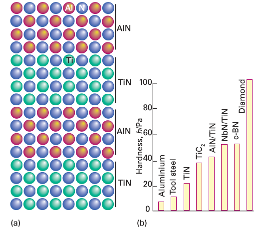 Figure 25.22 (a) The structure of an ultrahard AlN/TiN superlattice and (b) the hardness of a nitride superlattice and commonly used hard materials. (Adapted from S.A. Barnett and A. Madan, Physics World, 1998, 11, 45.)