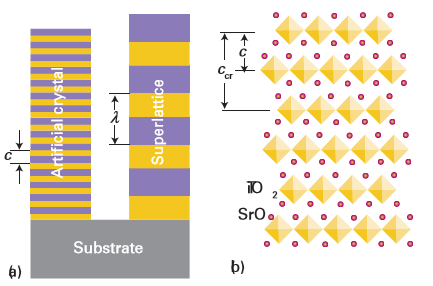 Key points: Artificially layered materials have a periodic repeat along the growth direction of a thin film; the periodic repeat is controlled by the number and type of sublayers deposited in sequence. The periodic repeat along the growth direction of a thin film in a superlattice is controlled by the number and type of sublayers deposited in sequence, whereas the lateral periodicity is determined by the coherency—the matching of lattice characteristics—between the