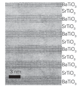 sublayers (Figures 25.22 and 25.23). It should be kept in mind that the superlattice is built bottom-up with periods in the nanometre range and total thicknesses in the micrometre range. The goal of materials chemists and engineers is to use these synthesis skills to control the properties and functionality of materials of this kind. Superlattice nitrides are ranked among the hardest known materials. The superlattice period and the chemical composition play important roles in determining the mechanical properties of such compounds, as the interfaces between the two nitride layers are responsible for the enhanced hardness. Figure 25.24 shows, for instance, that the maximum hardness of a typical superlattice occurs for periodicities in the range 5–10 nm. These superlattices have been successfully deposited using sputtering, pulsed laser deposition, and molecular beam epitaxy. Such superlattices are used on cutting tools and are made economically by using sputtering to form them. Perovskite oxides (Section 24.7) are used in numerous applications on account of their ferroelectric, acoustic, microwave, electronic, magnetic, and optical properties. The most widely used perovskite is BaTiO3, which is a very important dielectric material. It has been discovered that layering ferroelectric BaTiO3 with the isostructural perovskite SrTiO3 can lead to enhanced dielectric properties arising from lattice strain. The techniques of PLD, MBE, and CVD have all been used to create SrTiO3/BaTiO3 superlattice thin films (Fig. 25.25). Although the misfit between the two crystal structures is small enough to allow for epitaxial growth and the formation of coherent interfaces between each bilayer, the stress introduced at the interface is sufficient to improve the dielectric response, specifically the remanent polarization (the polarization in the absence of an applied field) of the superlattices, compared to undoped BaTiO3.