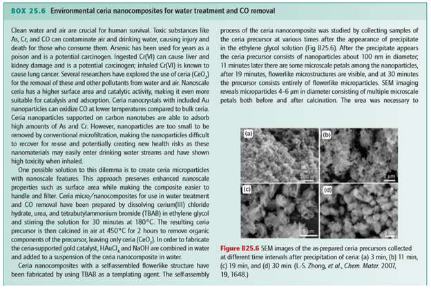 Proteins have been bound to nanoparticles by using a single site on the protein to yield hybrid nanomaterials. An important example of this type of material consists of proteins attached to fullerenes, which take advantage of the latter’s rich chemical and electronic properties, small dimensions, and potential applications. Alterations to the amino acid sequence of a protein are carried out by site-directed mutagenesis (SDM). By using SDM, a single cysteine residue, which selectively attaches to the fullerene, has been introduced in the protein sequence away from the active site to avoid deactivation on binding to the nanoparticles. Figure 25.40 illustrates one approach to create a covalent linkage between nanosized fullerenes and an active protein by using a functional tether (a bridging molecule). Many of these functionalized fullerenes have found biological applications as inhibitors of HIV protease, as light-sensitive biochemical probes, and in photodynamic tumour therapies. Engineering covalent linkages between nanomaterials and proteins has outstanding potential for future applications in drug delivery and enhanced drug efficacy. There is a new world of inorganic chemistry, as we have sought to show, waiting in the wings of our subject: this intermediate domain between the atomic and the bulk is waiting for discovery and exploitation. With exploitation comes the responsibility of careful consideration of the effects that nanomaterials will have on our environment both as novel materials for water filtration and remediation of biohazards and as sources of toxic pollutants (Box 25.6). It is essential to have a reliable and extensive grounding in the conventions of inorganic chemistry, to note what Nature has already achieved, and—above all—to build on it with imagination.