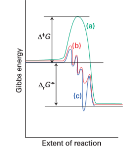 Figure 26.1 Schematic representation of the energetics of a catalytic cycle. The uncatalysed reaction (a) has a higher ∆‡G than a step in the catalysed reaction (b). The Gibbs energy of the overall reaction, ∆rGO, is the same for routes (a) and (b). The curve (c) shows the profile for a reaction mechanism with an intermediate that is more stable than the product.