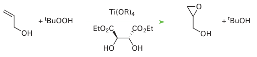 Key point: Appropriate chiral ligands can be used in conjunction with d-metal catalysts to induce chirality into oxidation products of organic substrates. In addition to catalysing reductions, d-metal complexes are also active in oxidations. For example, in the Sharpless epoxidation, prop-2-en-1-ol (allyl alcohol) or a derivative is oxidized with tert-butylhydroperoxide, in the presence of a Ti catalyst with diethyl tartrate as a chiral ligand, producing an epoxide: