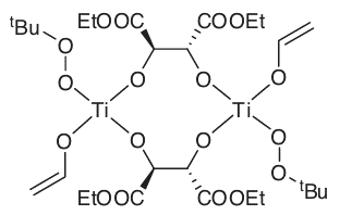 The reaction is thought to go through a transition state in which both the peroxide and the allyl alcohol are coordinated to a Ti atom through their O atoms. Each Ti atom is known to have one diethyl tartrate attached to it, and the chiral environment that the diethyl tartrate produces around the Ti atom is sufficient to differentiate the two prochiral faces of the allyl alcohol. Additional experimental evidence points to a dimeric intermediate (8). Enantiomeric excesses of greater than 98 per cent have been reported for Sharpless epoxidations.