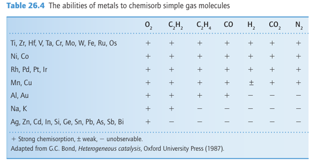 Key point: Adsorption is essential for heterogeneous catalysis to occur but must not be so strong that it blocks the catalytic sites and prevents further reaction. The adsorption of molecules on surfaces often activates molecules just as coordination activates molecules in complexes. The desorption of product molecules that is necessary to refresh the active sites in heterogeneous catalysis is analogous to the dissociation of a complex in homogeneous catalysis. Before a heterogeneous catalyst is used it is usually ‘activated’. Activation is a catch-all term. In some instances it refers to the desorption of adsorbed molecules such as water from the surface, as in the dehydration of γ-alumina. In other cases it refers to the preparation of the active site by a chemical reaction, such as by reduction of metal oxide particles to produce active metal particles. An activated surface can be characterized by the adsorption of various inert and re active gases. The adsorption may be either physisorption, when no new chemical bond is formed, or chemisorption, when surface–adsorbate bonds are formed (Fig. 26.16). Low temperature physisorption of a gas such as nitrogen is useful for the determination of the total surface area of a solid, whereas chemisorption is used to determine the number of exposed reactive sites. For example, the dissociative chemisorption of H2 on supported platinum particles reveals the number of exposed surface Pt atoms. The interaction of small molecules with metal surfaces is similar to their interaction with low-oxidation-state metal complexes. Table 26.4 shows that a wide range of metals chemisorb CO, and that fewer are capable of chemisorbing N2, just as there is a much wider variety of metals that form carbonyls than form dinitrogen complexes. Furthermore, just as with metal carbonyl complexes, both bridging and terminal CO surface species have been identified by IR spectroscopy. The dissociative chemisorption of H2 is analogous to the oxidative addition of H2 to metal complexes (Sections 10.5 and 22.7).