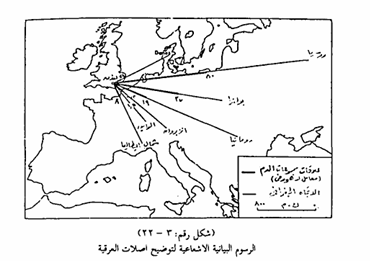 ونستطيع بطبيعة الحال توقيع هذا الشكل الاشعاعي على الخريطة مباشرة كما يظهر من الشكل رقم (3 ـ 22) والذي يوضح الصلات العرقية بين مجموعة انجليزية مختارة من (لندن) وبعض المجموعات الأوربية الأخرى اعتماما على مقياس مجموعات الدم blood groups ومن الرسم يمكن استنتاج أن طول خطوط الأشعة يتناسب مع المقدار الذي يمثله أو حجم الحركة.
