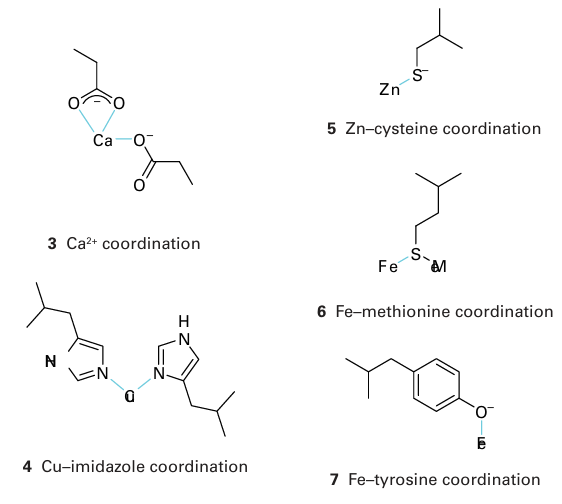 (like springs) and are important in converting processes that occur at the metal site into conformational changes; by contrast, a b-sheet region confers rigidity to support a pre organized coordination sphere suited to a particular metal ion (Sections 7.14 and 11.16). The secondary structure is largely determined by the sequence of amino acids: thus, the helix is favoured by chains containing alanine and lysine but is destabilized by glycine and proline. A protein that lacks its cofactor (such as the metal ions required for normal activity) is called an apoprotein; an enzyme with a complete complement of cofactors is known as a holoenzyme. An important factor influencing metal-ion coordination in proteins is the energy re quired to locate an electrical charge inside a medium of low permittivity. To a first ap proximation, protein molecules may be regarded as oil drops in which the interior has a much lower relative permittivity (about 4) than water (about 78). This difference leads to a strong tendency to preserve electrical neutrality at the metal site, and hence influence the redox chemistry and Brønsted acidity of its ligands. All amino acid residues can use their peptide carbonyl (or amide-N) as a donor group, but it is the side chain that usually provides more selective coordination. By referring to Table 27.2 and from the discussion in Section 4.12, we can recognize donor groups that are either chemically hard or soft and that therefore confer a particular affinity for specific metal ions. Aspartate and glutamate each provide a hard carboxylate group, and may use one or both O atoms as donors (3). The ability of Ca2 to have a high coordination number and its preference for hard donors are such that certain Ca2-binding proteins also contain the unusual amino acids -carboxyglutamate and hydroxyaspartate (generated by post-translational modification), which provide additional functionalities to enhance binding. Histidine, which has an imidazole group with two coordination sites, the ε-N atom (more common) and the -N atom, is an important ligand for Fe, Cu (4), and Zn. Cysteine has a thiol S atom that is expected to be unprotonated (thiolate) when involved in metal coordination. It is a good ligand for Fe, Cu, and Zn (5), as well as for toxic metals such as Cd and Hg. Methionine contains a soft thioether S donor that stabilizes Fe (II)(6) and Cu(I). Tyrosine can be deprotonated to provide a phenolate O donor atom that is a good ligand for Fe (III) (7). Selenocysteine (a specially coded amino acid in which Se replaces S) has also been identified as a ligand, for example it is found as a ligand to Ni in some hydrogenases (Section 27.14). A modified form of lysine, in which the side-chain −NH2 has reacted with a molecule of CO2 to produce a carbamate, is found as a ligand to Mg in the crucial photosynthetic enzyme known as rubisco (Section 27.9) and in other enzymes such as urease, where it is a ligand for Ni (II).