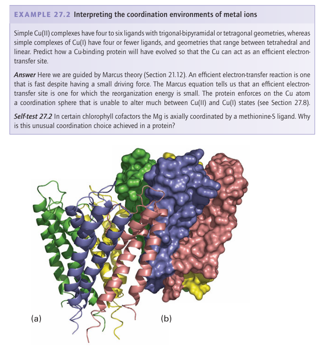 Key point: The likelihood that a protein will coordinate a particular kind of metal centre can be inferred from the amino acid sequence and ultimately from the gene itself. The structures of metal coordination sites have been determined mainly by X-ray diffraction (now mostly by using a synchrotron, Section 8.1) and sometimes by NMR spectros copy.3 The basic structure of the protein can be determined even if the resolution is too low to reveal details of the coordination at the metal site. The packing of amino acids in a protein is far denser than is commonly conveyed by simple representations, as may be seen by comparing the representations of the structure of the K channel in Fig. 27.3. Thus, even the substitution of an amino acid that is far from a metal centre may result in significant structural changes to its coordination shell and immediate environment. Of special interest are channels or clefts that allow a substrate selective access to the active site, pathways for long-range electron transfer (metal centres positioned less than 1.5 nm apart), pathways for long-range proton transfer (comprising chains of basic groups such as carboxylates and water molecules in close proximity, usually less than 0.3 nm apart), and tunnels for small gaseous molecules (which can be revealed by placing the crystal under Xe, an electron-rich gas).