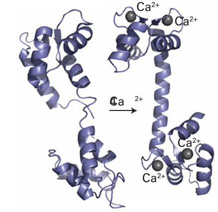 Figure 27.8 The binding of four Ca2+ to apocalmodulin causes a change in the protein conformation, converting it to a form that is recognized by many enzymes. The high proportion of α-helix is typical of proteins that are activated by metal-ion binding.