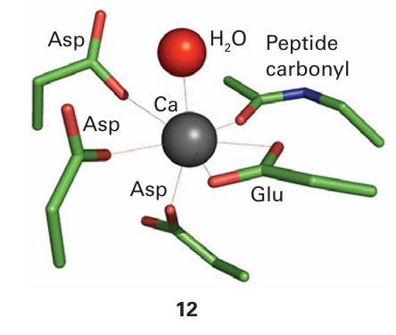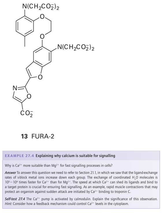 Key point: Calcium ions are suitable for signalling because they exhibit fast ligand exchange and a large, flexible coordination geometry. Calcium ions play a crucial role in higher organisms as an intracellular messenger, providing a remarkable demonstration of how organisms have exploited the otherwise rather limited chemistry of this element. Fluxes of Ca2+ trigger enzyme action in cells in response to receiving a hormonal or electrical signal from elsewhere in the organism. Calcium is particularly suited for signalling because it has fast ligand-exchange rates, intermediate binding constants, and a large, flexible coordination sphere. Calcium signalling proteins are small proteins that change their conformation depend ing on the binding of Ca2+ at one or more sites; they are thus examples of the metal ion activated proteins mentioned earlier. Every muscle movement we make is stimulated by Ca2+ binding to a protein known as troponin C. The best-studied Ca2-regulatory protein is calmodulin (17 kg mol–1, Fig. 27.8): its roles include activating protein kinases that catalyse phosphorylation of proteins and activating NO-synthase, a Fe-containing enzyme responsible for generating the intercellular signalling molecule nitric oxide. Calmodulin has four Ca2+-binding sites (one is shown as 12) with dissociation constants lying close to 10−6. The binding of Ca2+ to the four sites alters the protein conformation and it is then recognized by a target enzyme.5