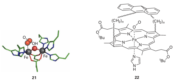 Key point: Proteins binding O2 reversibly do so by preventing its reduction and eventual O-O bond cleavage. This protection is difficult to achieve with small molecules. Certain elaborate macrocyclic Fe (II) complexes exhibit reversible O2 binding by providing steric hindrance to attack on the coordinated O2. Much effort has been spent on synthesizing simple complexes that coordinate O2 reversibly and could be used as blood substitutes in special circumstances, such as emergency surgery. The problem is that although O2 reacts with d-block metal ions to form complexes in which the O−O bond is retained (as in superoxo and peroxo species), these products tend to undergo irreversible decomposition involving rapid O−O bond cleavage and formation of water or oxides. Overcoming this problem requires complexes designed to protect the coordinated O−O ligand, preventing it from reacting further. Sterically hindered Fe(II) complexes such as the ‘basket’ porphyrin (22) achieve this protection by preventing a second Fe(II) complex from attacking the distal O atom of the superoxo species to form a bridged peroxo intermediate. As we shall see in Section 27.10, peroxo complexes of Fe (III) tend to undergo rapid O−O bond proteolysis, resulting in formation of H2O and Fe(IV) O.