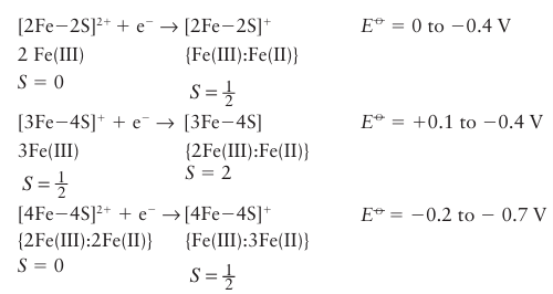 Key points: Iron–sulfur clusters generally operate at more negative potentials than cytochromes; they are composed of high-spin Fe (III) or Fe (II) with sulfur ligands in a mainly tetrahedral environment. Iron–sulfur clusters are widespread in biology, although their importance was not established as early as cytochromes on account of their lack of distinctive optical characteristics. By convention, FeS clusters are represented by square brackets showing how many Fe and non-protein S atoms are present, as in [2Fe–2S] (25), [4Fe–4S] (26), and [3Fe–4S] (27). The efficacy of FeS clusters as fast ET centres is largely due to their being able to delocalize the added electron to varying degrees, which minimizes bond length changes and decreases the reorganization energy. The presence of sulfur ligands to provide good lead-in groups is also important. Small ET proteins containing FeS clusters are known as ferredoxins, where as in many large enzymes, FeS clusters are arranged in a relay, less than 1.5 nm apart, to link remote redox sites in the same molecule. The relay concept is illustrated in Fig. 27.26 with a class of enzymes known as hydrogenases, which we discuss further in Section 27.14. In nearly all cases, the Fe atoms are tetrahedrally coordinated by cysteine thiolate (RS-) groups as the protein ligands. The overall assembly, including the protein ligands, is known as an ‘FeS centre’. Examples are known in which one or more of the Fe atoms is coordinated by non-thiolate amino acid ligands, such as carboxylate, imidazole, and alkoxyl (serine), or by an exogenous ligand such as H2 O or OH, and the coordination number about the Fe subsite may be increased to six. The cubane [4Fe 4S] (26) and cuboidal [3Fe 4S] (27) clusters are obviously closely related, and may even interconvert within a protein by the addition or removal of Fe from one subsite. Larger clusters also occur, such as the ‘super clusters’ [8Fe 7S] and [Mo–7Fe–8S–X] found in nitrogenase (Section 27.13). Despite the presence of more than one Fe atom, FeS clusters generally carry out single electron transfers and are good examples of mixed-valence systems comprising Fe (III) and Fe (II). The redox state of a cluster is commonly represented by summing the charges due to Fe (3+or 2+, respectively) and S atoms (2-) and the resultant overall charge, which is referred to as the oxidation level, is written as a superscript.