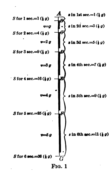 The motion of a falling body can be analyzed graphically as in Fig.1. Draw a vertical line and take a certain distance AB, from the top-of-the-line A, as the distance the body falls the first second, equal to 1/2g.