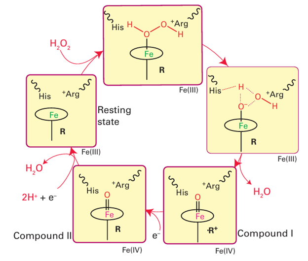 Key points: Peroxidases catalyse reduction of hydrogen peroxide; they provide important examples of Fe (IV) intermediates that can be isolated and characterized. Haem-containing peroxidases, as exemplified by horseradish peroxidase (HRP) and cyto chrome c peroxidase (CcP), catalyse the reduction of hydrogen peroxide: