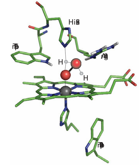 Figure 27.33 The active site of yeast cytochrome c peroxidase showing amino acids essential for activity and indicating how peroxide is bound in the distal pocket.