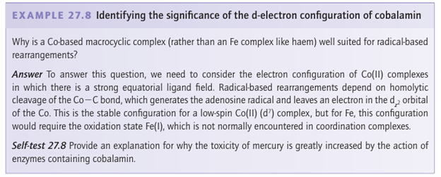 enzyme the bond is substantially weakened, resulting in homolytic cleavage of the Co-CH2R bond. This step results in five-coordinate low-spin Co (II) and a CH2 R radical, which gives rise to controlled radical chemistry in the enzyme active site pocket (Fig. 27.42). Important examples are methylmalonyl CoA mutase and diol dehydratases. In 1970, an alternative system for catalyzing radical-based rearrangements was discovered that does not depend on Co. As described in Box 27.1, the enzymes involved use instead a [4Fe-4S] cluster to generate the active deoxyadenosyl radical by reductive cleavage of its methionyl derivative.