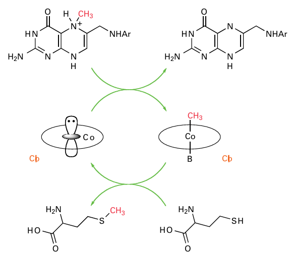 Methyl transfer reactions of cobalamins exploit the high nucleophilicity of square-planar Co(I). A particularly important example is methionine synthase, which is responsible for the biosynthesis of methionine. Methionine is produced by transferring a CH3 group, de rived from the methyl carrier methyl hydrofolate, to homocysteine. Not only is methionine an essential amino acid, but also accumulation of homocysteine (which occurs if activity is impaired) is associated with serious medical problems. The mechanism involves a ‘base on/base-off’ cycle in which Co(I) abstracts an electrophilic CH3 group (effectively CH3) from a quaternary N atom on N5-tetrahydrofolate to produce methylcobalamin, which then transfers CH3 to homocysteine (Fig. 27.41). Methylcobalamin is the methyl-trans ferring cofactor for a wide variety of biosynthetic pathways, including the production of antibiotics. In anaerobic microbes, methylcobalamin is involved in the synthesis of acetyl coenzyme A, an essential metabolite, and in production of methane by methanogens. Radical-based rearrangements catalysed by coenzyme B12 (but see Box 27.1) include isomerizations (mutases) and dehydration or deamination (lyases). The generic reaction is