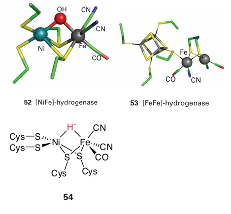 Key point: The active sites of hydrogenases contain Fe or Ni, along with CO and CN ligands. It has been estimated that 99 per cent of all organisms utilize H2. Even if these species are almost entirely microbes, the fact remains that almost all bacteria and archaea possess extremely active metalloenzymes, known as hydrogenases, that catalyse the interconversion of H2 and H (as water). The elusive molecule H2 is produced by some organisms (it is a waste product) and used by others as a fuel, helping to explain why so little H2 is in fact detected in the atmosphere (Box 10.1). Human breath contains measurable amounts of H2 due to the action of bacteria in the gut. Hydrogenases are very active enzymes, with turnover frequencies (molecules of substrate transformed per second per molecule of enzyme) exceeding 10 000 s 1. They are therefore attracting much attention for the insight they can provide regarding clean production of H2 (Section 10.4, Box 10.3) and oxidation of H2 in fuel cells—technology that currently depends greatly on Pt (Box 5.1). There are three classes of hydrogenase, based on the structure of the active site. All contain Fe and some also contain Ni. The two best-characterized types are known as [NiFe]-hydrogenases and [FeFe]-hydrogenases, and structures of the active sites of two representative enzymes are shown as (52) and (53). The active sites contain at least one CO ligand, and provide further examples of biological organometallic active sites (in addition to coenzyme B12). Further ligation is provided by CN, cysteine (and sometimes selenocysteine), and the active site of [FeFe]-hydrogenases (the site is commonly referred to as an ‘H-cluster’) contains a [4Fe-4S] cluster linked by a bridging cysteine thiolate, and an unusual bridging bidentate ligand that is thought to be either dithiomethylamine or dithiomethylether. These fragile active sites are buried deeply within the enzyme, thus necessitating special pores and pathways to convey H2 and H, and a relay of FeS clusters for long-range electron transfer (as shown in Fig. 27.26). The [FeFe]-enzymes tend to operate in the direction of H2 production; they are usually found in strictly anaerobic organisms and are very sensitive to O2. The mechanism of catalysis is uncertain, but it involves the participation of unusual Fe(I) species: the form assigned as Fe(I)Fe(I) binds H and that assigned as Fe (II)Fe(I) binds H2, probably in an analogous mannerto the dihydrogen complex shown (11) in Section 10.6. The [NiFe]-enzymes are noted for H2 oxidation and a catalytically active form assigned by EPR spectroscopy as Ni (III)–H (a hydrido complex) has been identified (54). Single-crystal EPR studies show that the unpaired electron is coupled strongly to an H-atom nucleus lying along an axis that points towards the Fe (that is, the H is in a bridging position). The active sites of [NiFe]- and [FeFe]-hydrogenases react with O2, often irreversibly, and this sensitivity is a limiting fac tor in developing and exploiting renewable H2 production by microorganisms (Section 10.4 and Box 10.1).