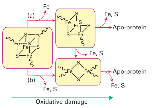 Figure 27.48 The degradation of Fe-S clusters forms the basis for a sensory system The [4Fe 4S] cluster cannot support a state in which all Fe are Fe (III); thus severe oxidizing conditions, including exposure to O2 , causes their breakdown to [3Fe-4S] or [2Fe-2S] and eventually complete destruction. Degradation to [3Fe-4S] (a) requires only removal of an Fe subsite whereas degradation to [2Fe-2S] (b) may require rearrangement of the ligands (cysteine) and produce a significant protein conformational change. These processes link cluster status to availability of Fe as well as O2 and other oxidants and provide the basis for sensors and feedback control.