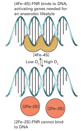 Figure 27.50 The principle of operation of the fumarate nitrate regulatory system that controls aerobic versus anaerobic respiration in bacteria.