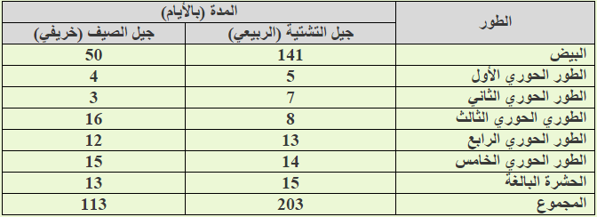 تبدأ الإناث بوضع بيضها على سطحي الخوص والسعف مغروزاً في النسيج في شهر تشرين الأول والثاني حيث يبقى طوال فترة الأشهر الباردة سابتاً حتى منتصف نيسان حيث يفقس منه حوريات متغذية نشطة تمر بخمسة أطوار حورية ثم تتحول إلى طور بالغ يبدأ بوضع البيض خلال الأسبوع الثاني من شهر حزيران يدخل هذا البيض في فترة سبات صيفية لمواجهة الحرارة العالية ويبدأ في الفقس خلال الأسبوع الأول من شهر آب وحتى أيلول ثم تخرج منه حوريات وبالغات الجيل الخريفي.
