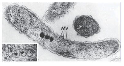 Figure 27.56 Magnetite crystals in magnetotactic bacteria. These are tiny compasses that guide these organisms to move vertically in river bed sludge. MV indicates empty vesicles (Photograph supplied by Professor S. Mann, University of Bristol.)