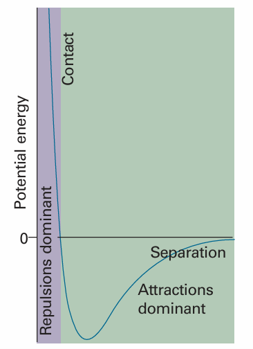 Fig. 1.13 The variation of the potential energy of two molecules on their separation. High positive potential energy (at very small separations) indicates that the interactions between them are strongly repulsive at these distances. At intermediate separations, where the potential energy is negative, the attractive interactions dominate. At large separations (on the right) the potential energy is zero and there is no interaction between the molecules.