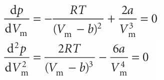 The principal features of the van der Waals equation can be summarized as follows. (1) Perfect gas isotherms are obtained at high temperatures and large molar volumes. When the temperature is high, RT may be so large that the first term in eqn 1.21b greatly exceeds the second. Furthermore, if the molar volume is large in the sense Vm >> b, then the denominator Vm − b ≈ Vm. Under these conditions, the equation reduces to p = RT/Vm, the perfect gas equation. (2) Liquids and gases coexist when cohesive and dispersing effects are in balance. The van der Waals loops occur when both terms in eqn 1.21b have similar magnitudes. The first term arises from the kinetic energy of the molecules and their repulsive interactions; the second represents the effect of the attractive interactions. (3) The critical constants are related to the van der Waals coefficients. For T<Tc, the calculated isotherms oscillate, and each one passes through a mini mum followed by a maximum. These extrema converge as T→Tc and coincide at T=Tc; at the critical point the curve has a flat inflexion (4). From the properties of curves, we know that an inflexion of this type occurs when both the first and second derivatives are zero. Hence, we can find the critical constants by calculating these derivatives and setting them equal to zero: