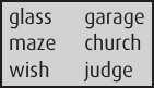 These words all already end in sounds (again, not letters) that are either [s] or [z] or sounds very similar to them. They are all ‘‘noisy’’ sounds. For the plural forms of these words, we add a vowel sound (written with the letter e) followed by a [z] sound (but written with the letter s): glasses, mazes, wishes, garages, churches, judges. If you think about it, pronouncing a vowel between the noisy sound at the end of the noun and the noisy sound [z] of the plural makes sense: without that vowel, we would have two noisy sounds in a row, something that would be harder for the listener to hear clearly.