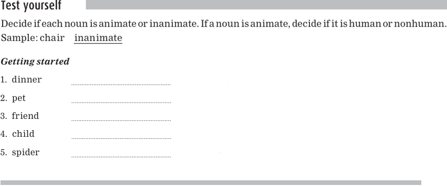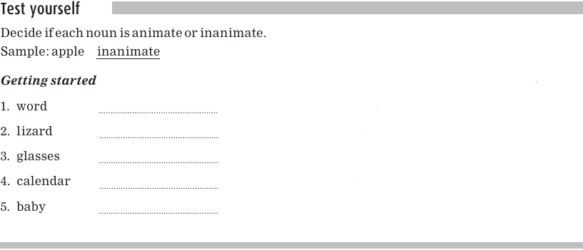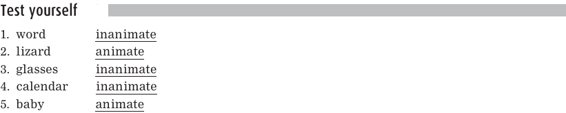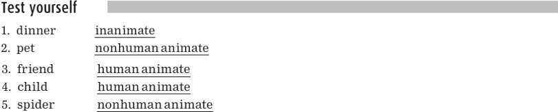To summarize: nouns may be human animate(teacher), nonhuman animate(dog), or inanimate (postcard).