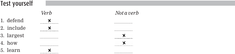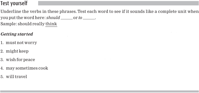 Here are some examples of verbs. You can see that they all meet the test with should and the test with to.