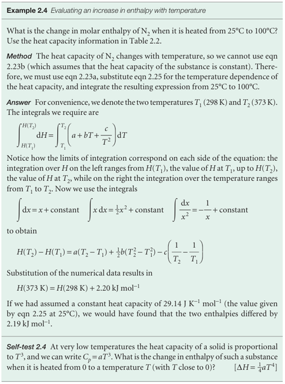 The enthalpy of a substance increases as its temperature is raised. The relation between the increase in enthalpy and the increase in temperature depends on the conditions (for example, constant pressure or constant volume). The most important condition is constant pressure, and the slope of the tangent to a plot of enthalpy against temperature at constant pressure is called the heat capacity at constant pressure, Cp, at a given temperature (Fig. 2.14). More formally: