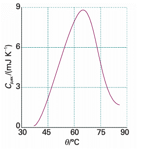 Fig. 2.16 A thermogram for the protein ubiquitin at pH = 2.45. The protein retains its native structure up to about 45oC and then undergoes an endothermic conformational change. (Adapted from B. Chowdhry and S. LeHarne, J. Chem. Educ. 74, 236 (1997).)