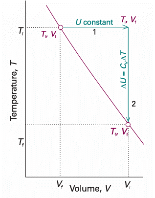 We are now equipped to deal with the changes that occur when a perfect gas expands adiabatically. A decrease in temperature should be expected: because work is done but no heat enters the system, the internal energy falls, and therefore the temperature of the working gas also falls. In molecular terms, the kinetic energy of the molecules falls as work is done, so their average speed decreases, and hence the temperature falls. The change in internal energy of a perfect gas when the temperature is changed from Ti to Tf and the volume is changed from Vi to Vf can be expressed as the sum of two steps (Fig. 2.17). In the first step, only the volume changes and the temperature is held constant at its initial value. However, because the internal energy of a perfect gas is independent of the volume the molecules occupy, the overall change in internal energy arises solely from the second step, the change in temperature at constant volume. Provided the heat capacity is independent of temperature, this change is