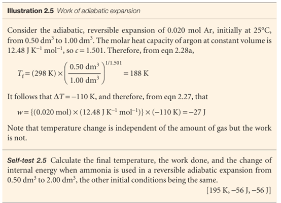 That is, the work done during an adiabatic expansion of a perfect gas is proportional to the temperature difference between the initial and final states. That is exactly what we expect on molecular grounds, because the mean kinetic energy is proportional to T, so a change in internal energy arising from temperature alone is also expected to be proportional to ∆T. In Further information 2.1 we show that the initial and final temperatures of a perfect gas that undergoes reversible adiabatic expansion (reversible expansion in a thermally insulated container) can be calculated from