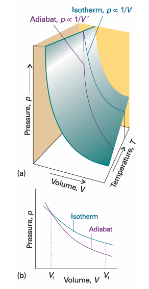 Fig. 2.18 An adiabat depicts the variation of pressure with volume when a gas expands adiabatically. (a) An adiabat for a perfect gas undergoing reversible expansion. (b) Note that the pressure declines more steeply for an adiabat than it does for an isotherm because the temperature decreases in the former.
