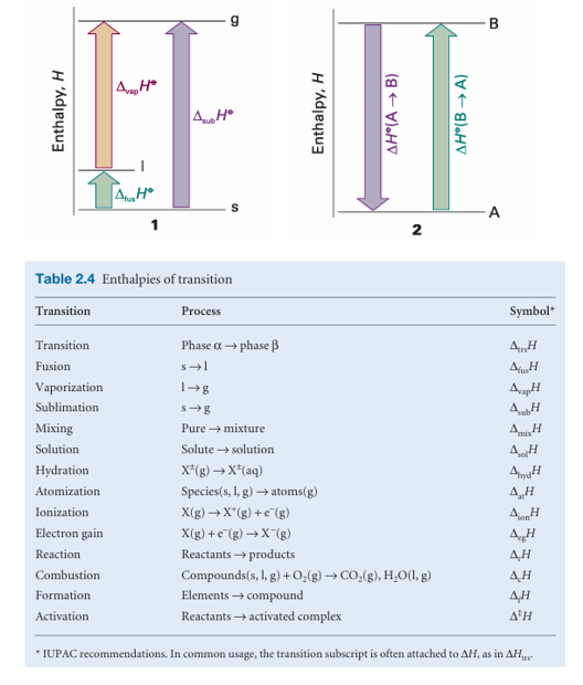 The different types of enthalpies encountered in thermochemistry are summarized in Table 2.4. We shall meet them again in various locations throughout the text.