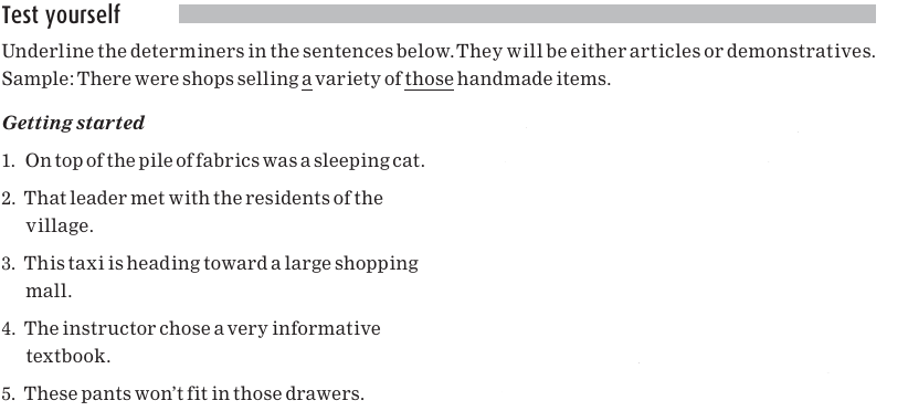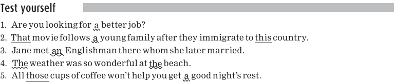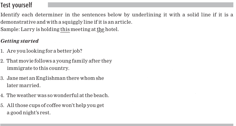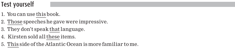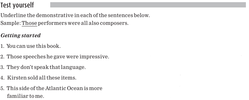 Notice again that, just like articles, each of these can occur directly before a noun: this table, these tables, that idea, those ideas. Demonstratives are words that ‘‘point’’ to some thing or someone.
