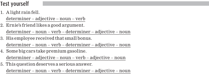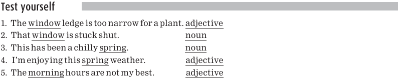 Let’s make sure that each of the underlined words above passes the adjective test, that is, that it can appear between the and a noun.