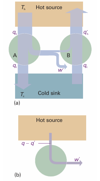 Fig. 3.10 (a) The flow of energy as heat from a cold source to a hot sink is not spontaneous. As shown here, the entropy increase of the hot sink is smaller than the entropy increase of the cold source, so there is a net decrease in entropy. (b) The process becomes feasible if work is provided to add to the energy stream. Then the increase in entropy of the hot sink can be made to cancel the entropy decrease of the hot source.