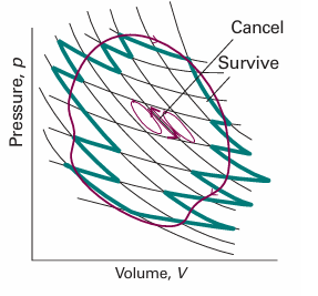 Fig. 3.9 A general cycle can be divided into small Carnot cycles. The match is exact in the limit of infinitesimally small cycles. Paths cancel in the interior of the collection, and only the perimeter, an increasingly good approximation to the true cycle as the number of cycles increases, survives. Because the entropy change around every individual cycle is zero, the integral of the entropy around the perimeter is zero too.