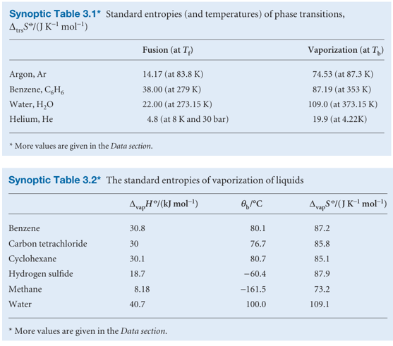 If the phase transition is exothermic (∆trsH < 0, as in freezing or condensing), then the entropy change is negative. This decrease in entropy is consistent with localization of matter and energy that accompanies the formation of a solid from a liquid or a liquid from a gas. If the transition is endothermic (∆trsH > 0, as in melting and vaporization), then the entropy change is positive, which is consistent with dispersal of energy and matter in the system. Table 3.1 lists some experimental entropies of transition. Table 3.2 lists in more detail the standard entropies of vaporization of several liquids at their boiling points. An interesting feature of the data is that a wide range of liquids give approximately the same standard entropy of vaporization (about 85 J K−1 mol−1): this empirical observation is called Trouton’s rule.