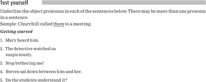 The underlined nouns in the sentences above are not subjects. Rather, they are objects: they either follow the main verb or they follow a preposition. Pronouns that replace objects, like those underlined in sentences 7b,8b, and 9b above, are called object pronouns.