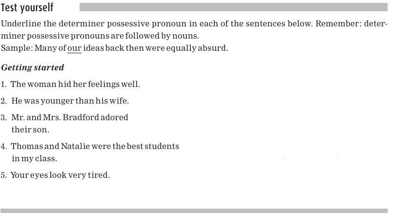 The possessive pronouns in sentences 1 and 2 may look familiar to you. As part of our discussion of determiners. Like articles (a, an, the), possessive pronouns which function as determiners can occur in the slot ______ house (for example, his house, our house, your house). Since they function as determiners, you can understand why they are followed by a noun. We called these determiner possessive pronouns and provided the full list. We repeat them here: my, your, his, her, its, our, their.
