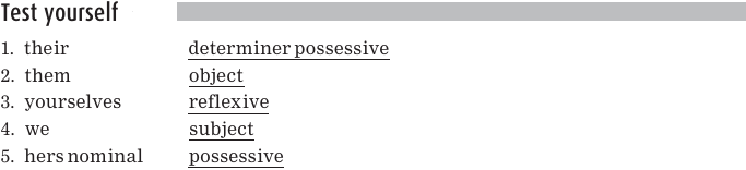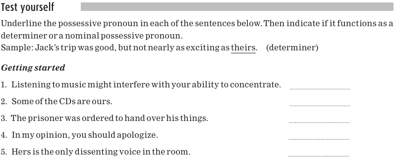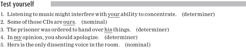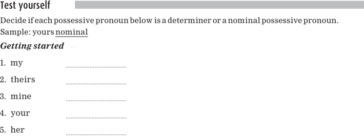 Notice that the pronouns his and its can function either as determiner possessive pro nouns or as nominal possessive pronouns.