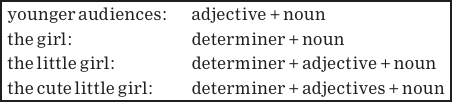A noun phrase can consist of a determiner, one or more adjectives, and a noun. The determiner and adjective(s) are optional.