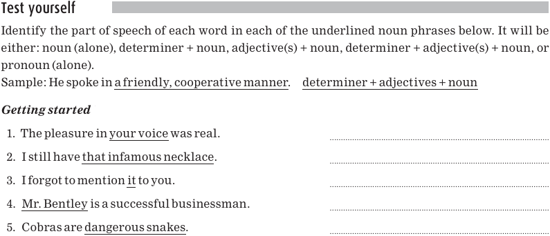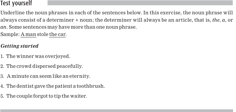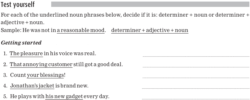 Here are some more examples with different determiners and nouns. (You may recall that the determiner always comes before the noun.) The whole noun phrase is underlined.