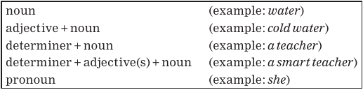 To sum up, the kinds of noun phrases we’ve discussed are listed below. While there are more kinds of noun phrases, what we’ve done here is to show you some basic ones.