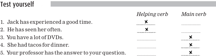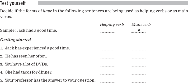 Sentences with the helping verb have are said to be expressed in the perfect aspect, which adds information to the main verb about real-world time. For example, in sentence 2, using have indicates that the action began in the past and is complete.