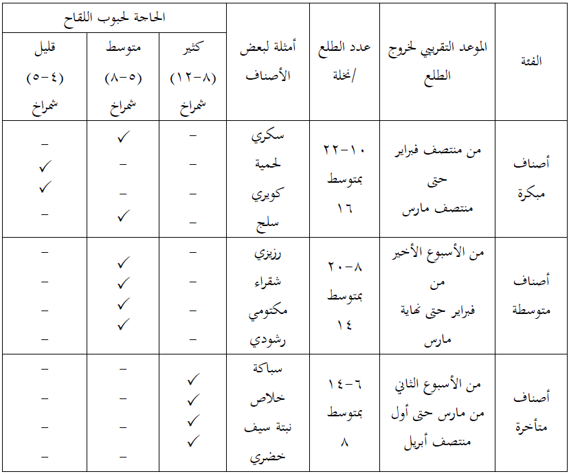 جدول يوضح تقسيم اصناف النخيل حسب موعد التزهير ومدى قابليتها لحبوب اللقاح.