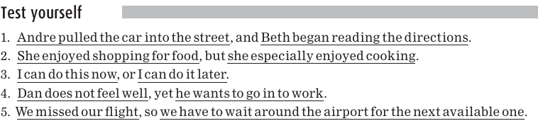 Conjunctions, like and, or, and but, join things. In fact, the two sentences within sentence 1 are joined by the conjunction and. Recall also that there are two kinds of conjunctions, coordinating and subordinating. The sentences in a compound sentence are joined together by a coordinating conjunction. As we discussed that there are three common coordinating conjunctions; they are and, or, and but. Four less common ones are for, so, yet, and nor. (Remember FANBOYS, which contains the first letter of each.)